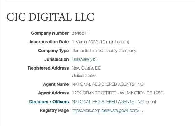 There is a CIC Digital LLC registered in Delaware too; opened in March 2022. Again, no transparency on ownership.