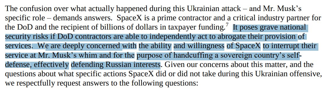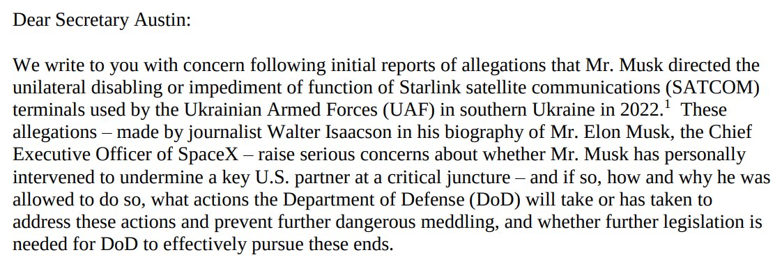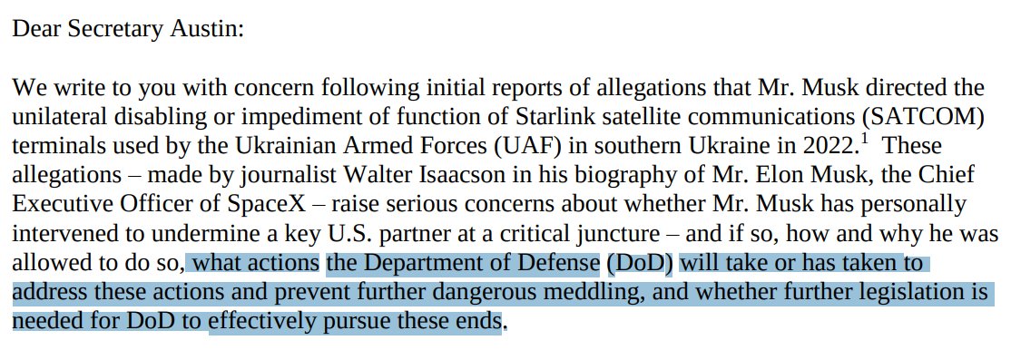 The new letter from Senate Dems is highly illuminating and important, because it shows how Dems will try to piece together a fuller understanding of Musk's influence and whether Starlink's contracts with the Defense Department have adequate safeguards built into them.