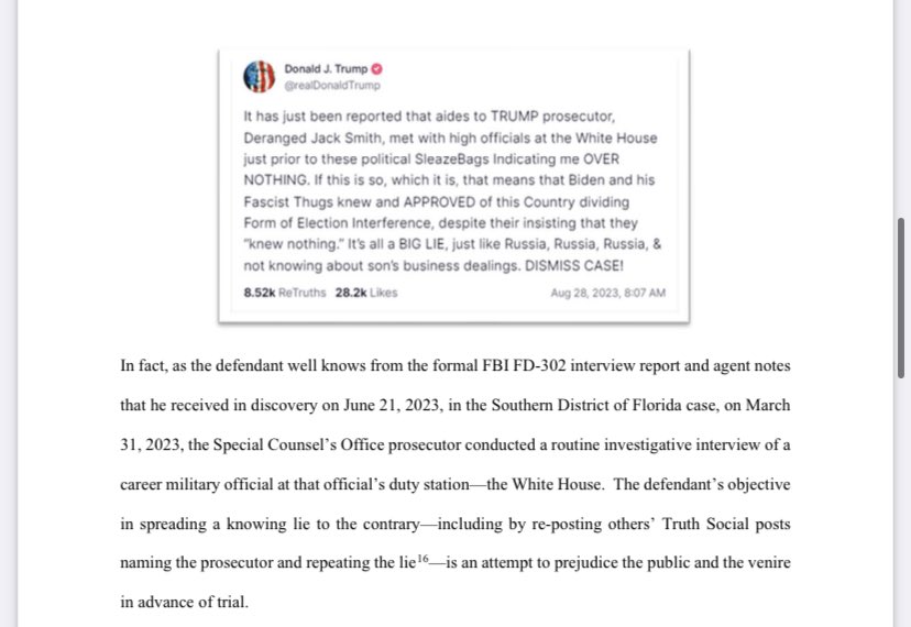 Taken together, the filings are an extraordinary assessment by prosecutors that a former US president poses a unique danger to the justice system, spreading "knowing lies" in ways that stoke threats and actual violence — but continuing to do so anyway. politico.com/news/2023/09/1…