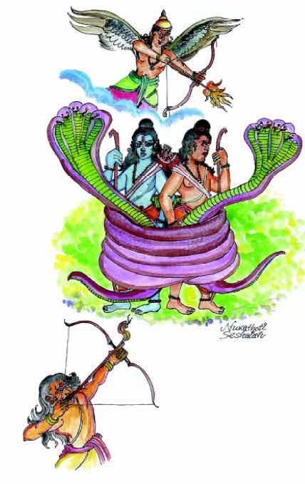லக்ஷ்மணனும். நாரத மகரிஷி பார்த்து பதறி, வைகுண்டம் போய் கருடனிடம், “இராமபிரானை இந்திரஜித்தின் நாக பாஸத்திலிருந்து விடுவிக்க உன்னால் மட்டுமே முடியும். நீ உடனே சென்று இராமபிரானை காப்பாற்று” என்றார். கருட பகவான் வந்து தன் சிறகுகளால் வீசி அவர்களை மூர்ச்சையிலிருந்து தெளிய வைத்தார்.