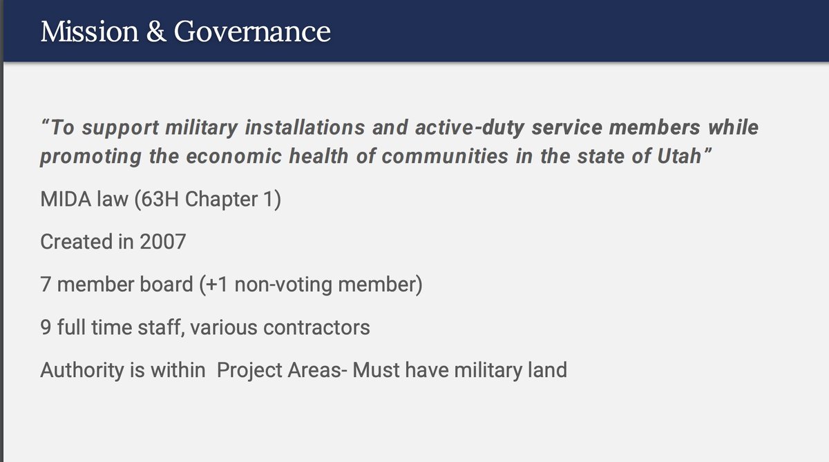 In '07, the Utah legislature creates the Military Installation Development Authority (MIDA), tasked with overseeing the development of military-controlled land. MIDA's mandate is to use public-private partnerships and tools like an Enhanced Use Lease, whereby private groups develop the land for commercial purposes, and the military collects cash or payments-in-kind to fund future development.