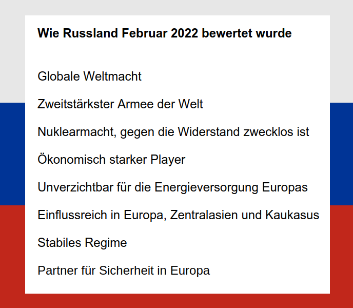Wobei der Kreml aus seinen Absichten und Zielen keinen Hehl macht und auch seine Taten sprechen lässt.