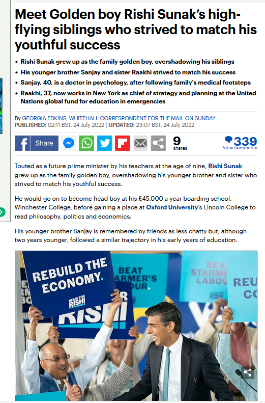 "GP father Yashvir and pharmacist mother Usha, who lived in a six-bedroom house in Southampton, paid for younger brother Sanjay to go to the same private primary as Rishi, Stroud School."..