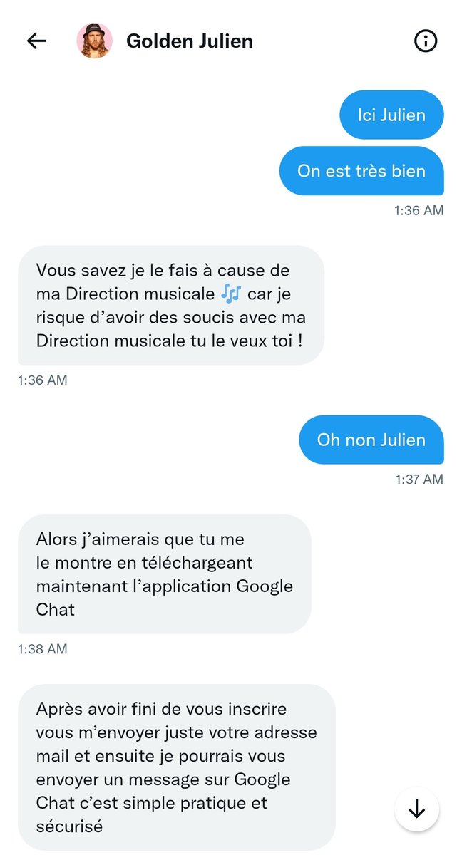 Comme à leur habitude, l escroc mz força la main pour qu on aille discuter sur Google Chat ( ça leur permet de sécuriser leur victime avant que leur compte saute)