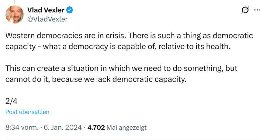 So dominiert er Debatten, Denk- und Abstimmungsprozesse und überfordert die “demokratische Kapazitäten”, wie es Vlad Vexler formulierte.