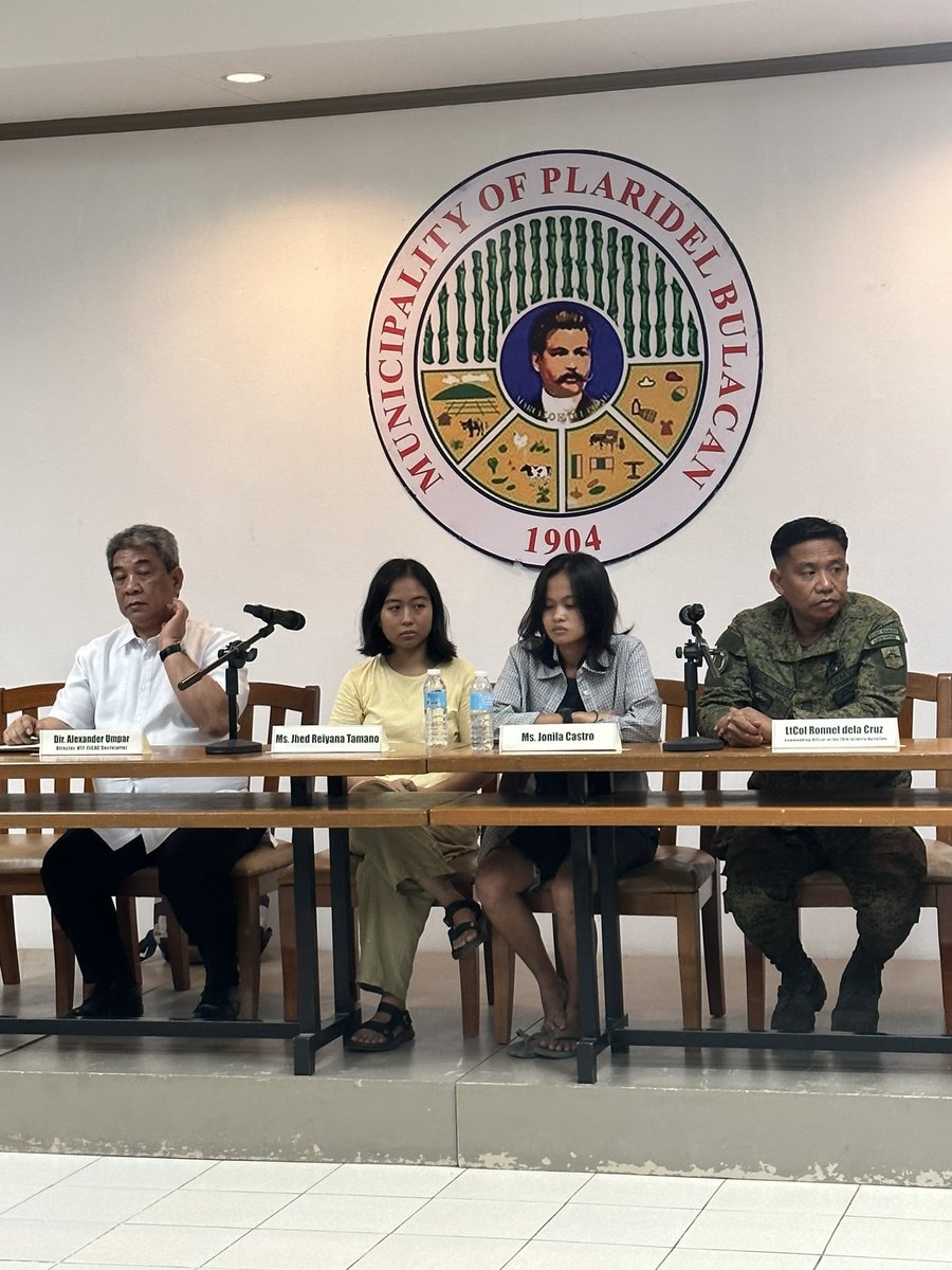 Present in today’s media briefing include Plaridel, Bulacan Mayor Jocell Aimee Vistan, NTF-ELCAC Secretariat Director Alexander Umpar, and Lt. Col. Ronnel dela Cruz, Commanding Officer of the 70th Infantry Battalion. | @EJgomezzzz