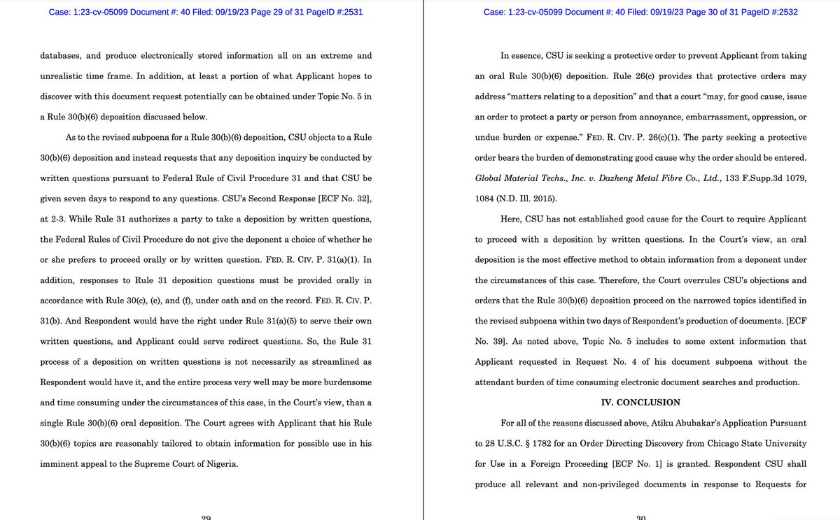 JUDGE JEFFREY T. GILBERT, SITTING AT THE US DISTRICT COURT OF NORTHERN ILLINOIS, HAS RULED ON THE CIVIL CASE FILED BY ATIKU ABUBAKAR, GRANTONG THE APPLICANT'S REQUEST TO THE COURT, AND ORDERED THE CHICAGO STATE UNIVERSITY TO RELEASE ALL RELEVANT DOCUMENTS PERTAINING TO BOLA AHMED TINUBU'S PURPORTED ADMISSION & TIME AT CSU