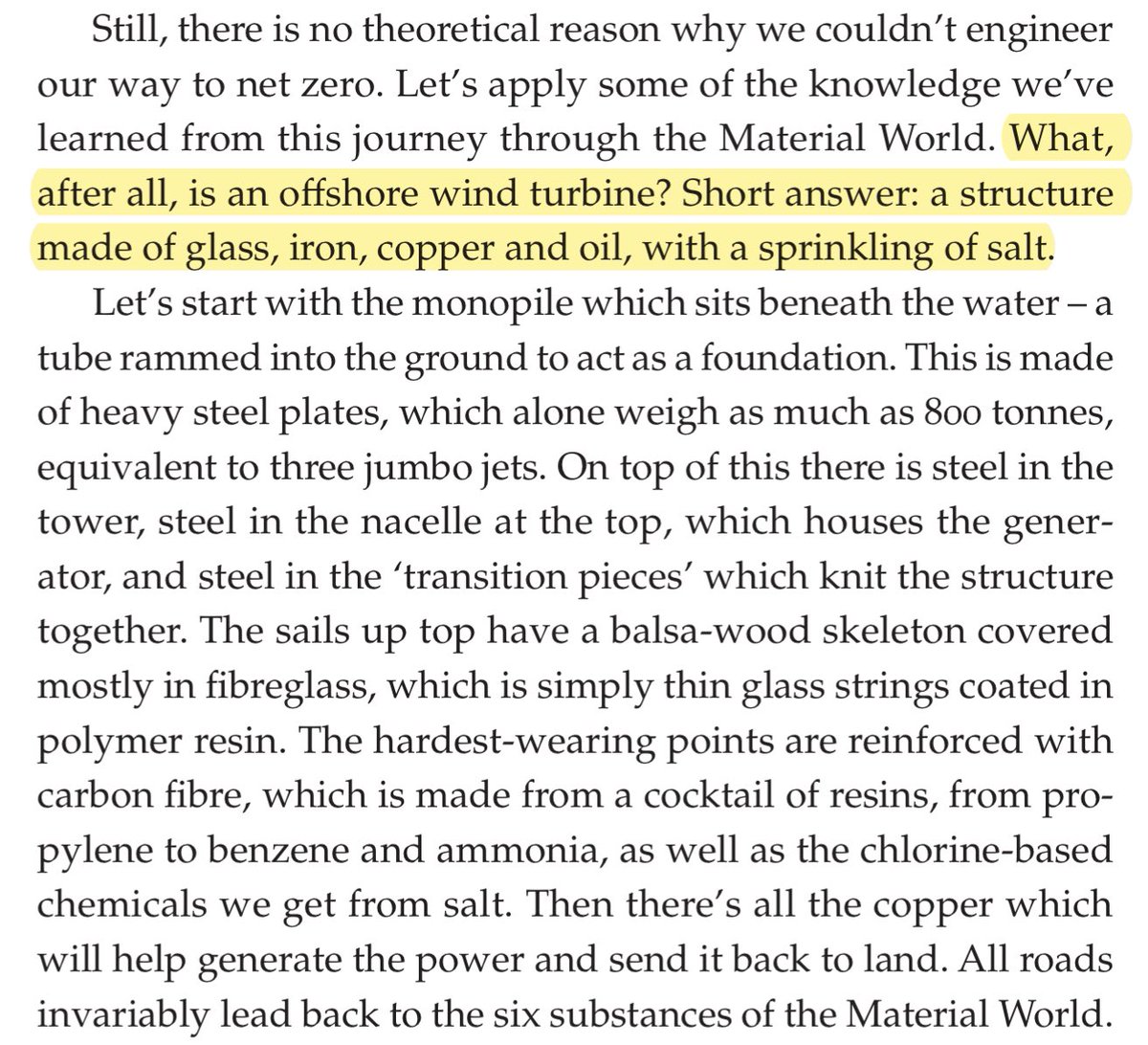 Making offshore wind turbines involves the deployment of HUGE amounts of steel, copper, concrete, fibreglass etc.