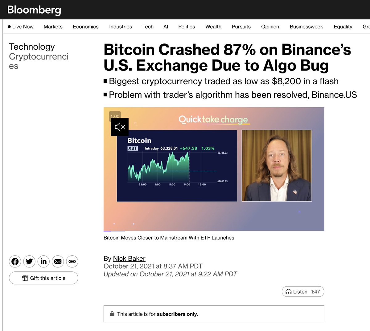Binance US - which was the epicenter of the flash crash - released a statement claiming that it had been caused by one of their "institutional traders" who had a "bug in their trading algorithm"