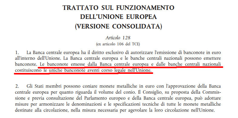 La moneta a corso legale è definita dall’art.128 del TFUE, secondo il quale: 1. La BCE autorizza se stessa e le BCN ad emettere banconote in euro, che costituiscono le uniche banconote aventi corso legale nell'Unione. 2. Gli Stati membri possono coniare monete metalliche in euro con l'approvazione della BCE per quanto riguarda il volume del conio.