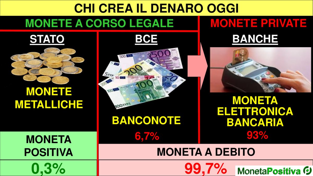 Queste sono circa le percentuali delle monete che usiamo, l’uniche monete positive senza debito sono le monete metalliche create dallo Stato, ma sono solo lo 0,3% di tutta la moneta che usiamo.
