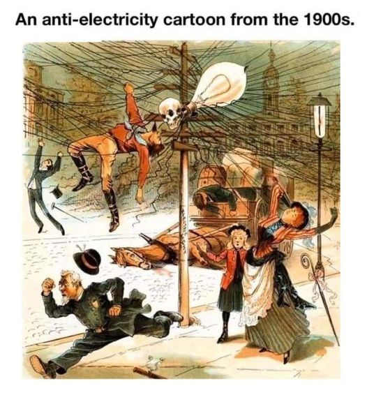 1/11 I wrote this article as I'd come across viral pictures of an 'anti-electricity' cartoon being used to show how the public often block new technologies that benefit them. View is that windfarms/nuclear/tech are today undermined by a hysterical public.