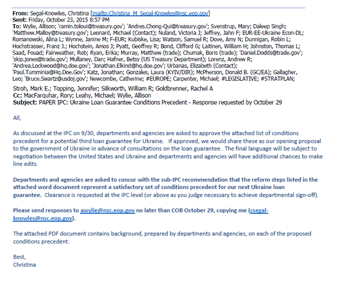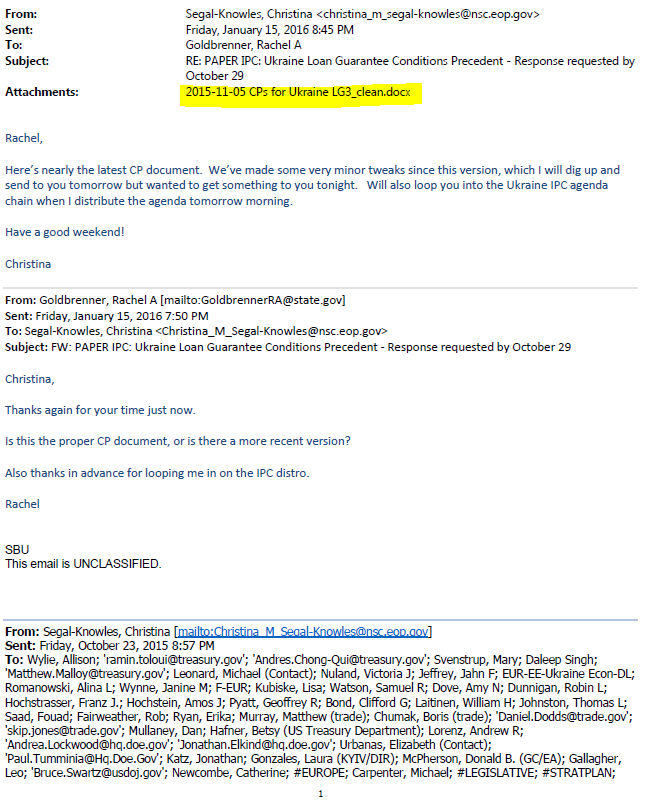 later, on Jan 15, 2016 (on eve of meeting with Ukrainian prosecutors), Segal-Knowles (at NSC with Ciaramella and Zentos) sent document entitled "2015-11-05 CPs for Ukraine LG3_clean.docx" [CPs=Conditions Precedent]. See Pyatt Transcript Exhibits, p 143.