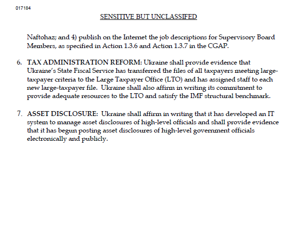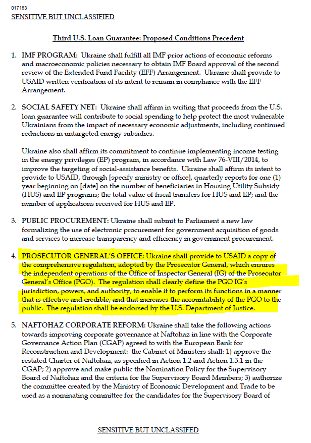The 2015-11-05 Conditions Precedent were shown in Pyatt Transcript Exhibits, p 147-148 (the very end). In regard to Prosecutor General, they required establishment of Inspector General office in Prosecutor General Office. Nothing about firing Shokin.