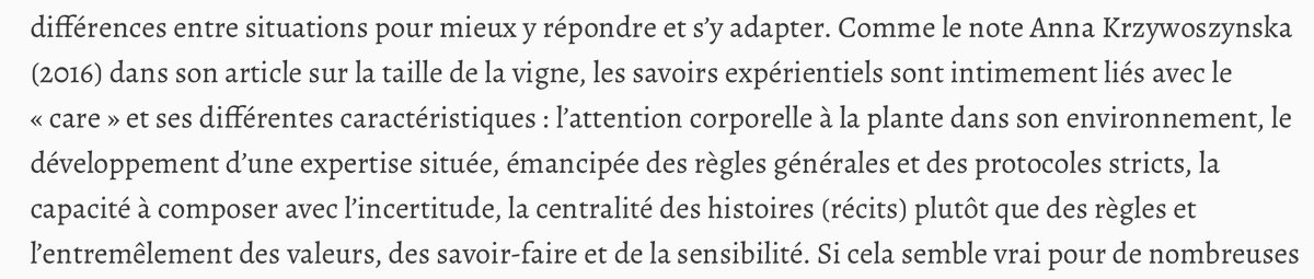 Je retiens que l’article ne contient aucune description des gestes concrets par lesquels est censé passer le soin, l'attention, si ce n’est une définition très générale du 𝘤𝘢𝘳𝘦 en agriculture
