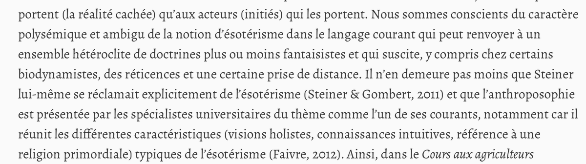 Mais allons tout de suite sur ce qui fâche, et ce qui a motivé ce fil: sans même parler des "sociologues" farfelus, les (trop!) nombreuses publications en sciences humaines et sociales qui présentent l’agriculture biodynamique comme le nec plus ultra de l’agriculture vertueuse
