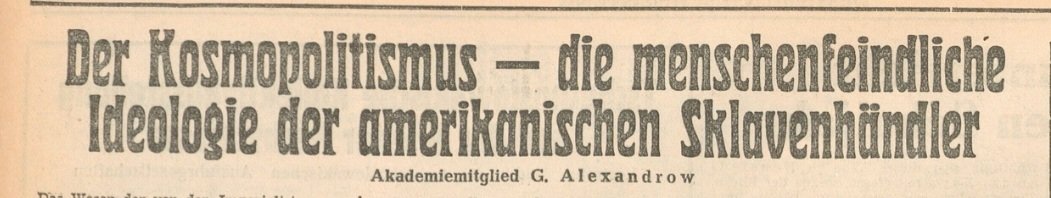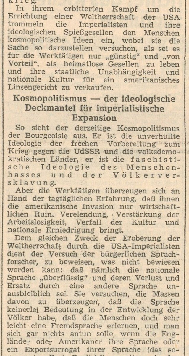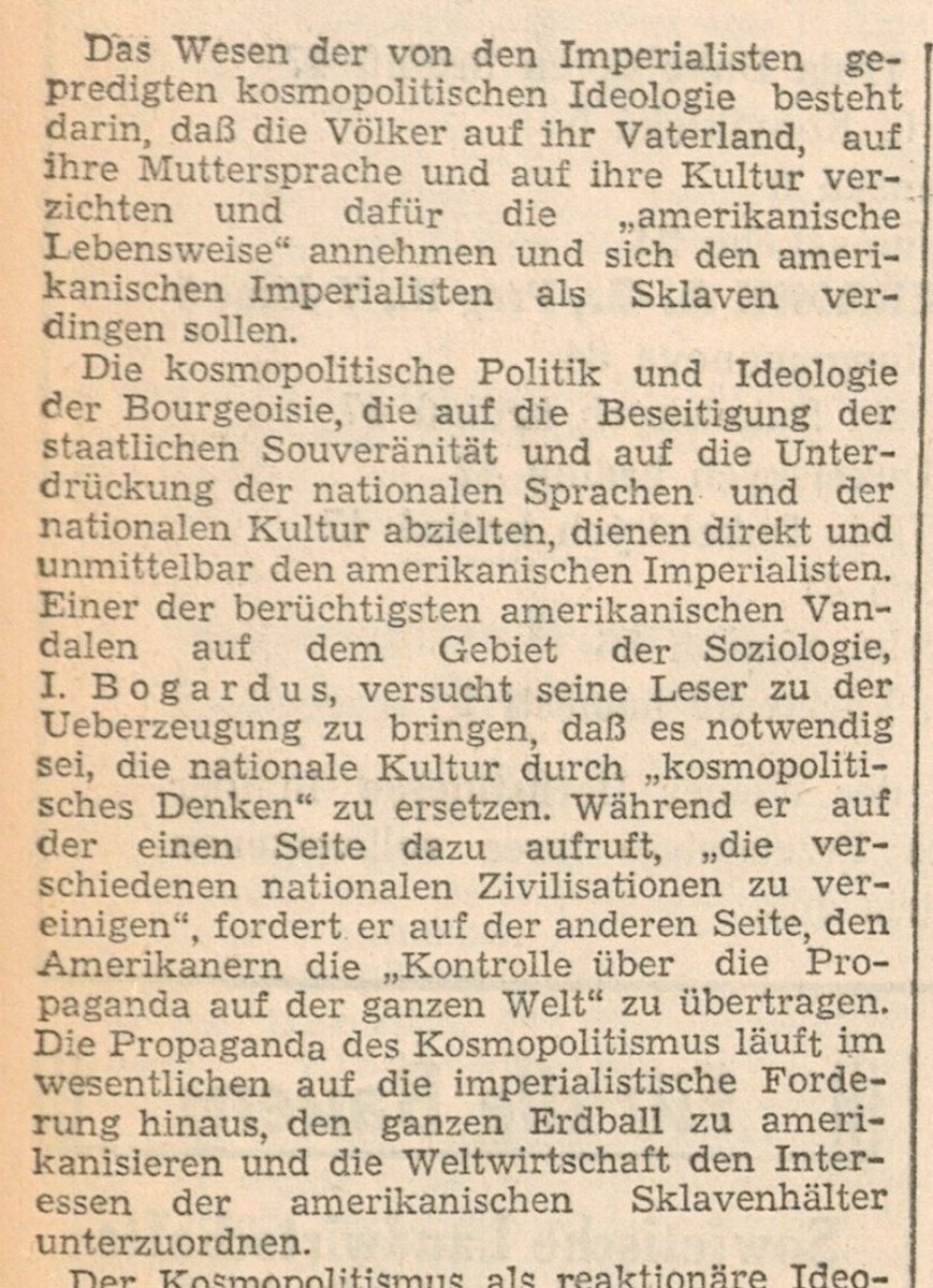 1952 verstärkte Stalin den Kampf gegen "Kosmopoliten", die versuchen würden Kultur, Sprache u. Tradition der Völker zu Gunsten einer globalen u. einheitlichen "Weltkultur" zu beseitigen. Als Drahtzieher machte Stalin die amerikanischen "Imperialisten" aus, die ganze Völker in/2