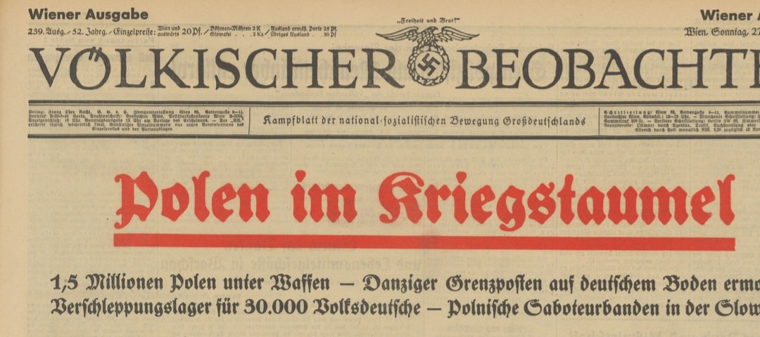 Das "demokratisch-plutoktatische Weltsystem" habe sich gegen d. "deutsche Revolution" verschworen. Die "wirklichen Freunde des Friedens" stünden an der Seite Deutschlands. Polen sei durch "unmenschliche Verbrechen u. unerträgliche Provokationen" für d. Eskalation verantwortlich/2