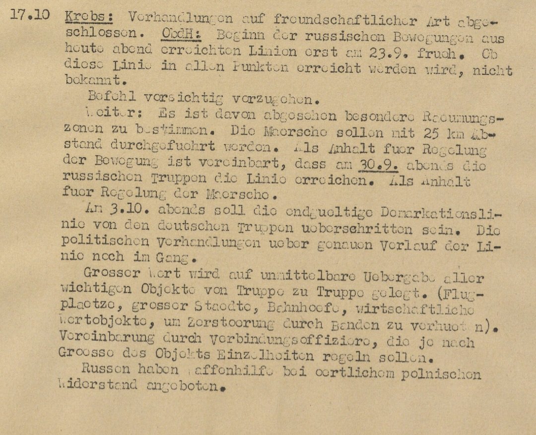 gewissenlose Politik seiner Regierung geraten" sei. Wie zynisch dieses "Angebot" war zeigt ein Blick ins Archiv. Oberst (später General) Hans Krebs (1898-1945) berichtet dem dt. Generalstab vom sowjetischen Angebot "Waffenhilfe bei örtlichen polnischen Widerstand" zu leisten/3