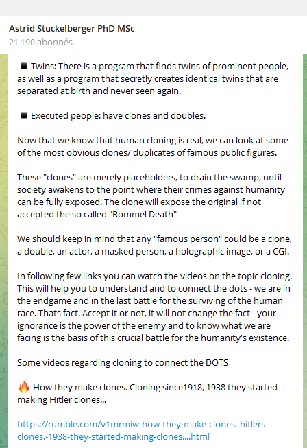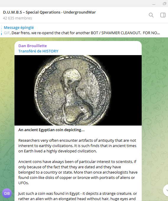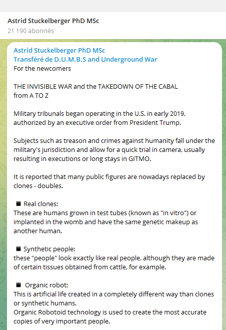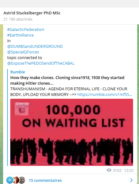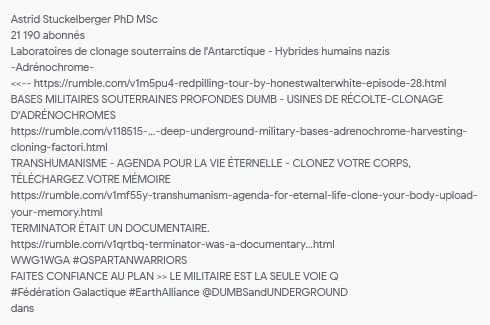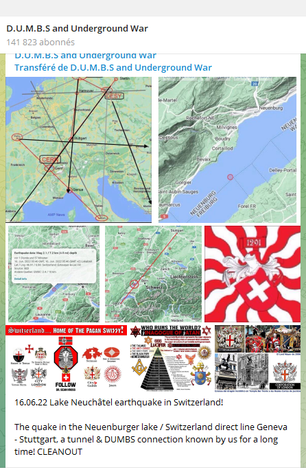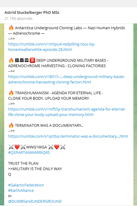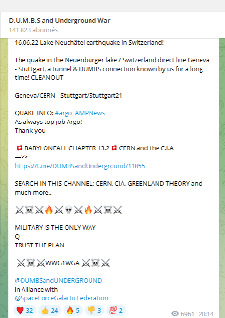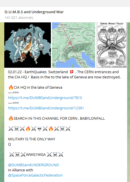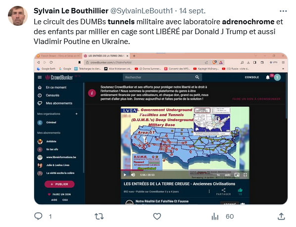 3/n : Il en existe d’autres, de ces chaînes, comme celle-ci. Elles débordent toutes un peu des histoires de tunnels et relaient toutes les infox les plus pourries du web. Du platisme à l’apologie de Poutine, co-dirigeant de l’ «Alliance» avec Trump… Sans oublier les reptiliens…
