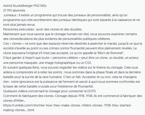 9/n : Fabrication de jumeaux clonés par la cabale afin de faire réapparaître les personnes après exécution de l’original.