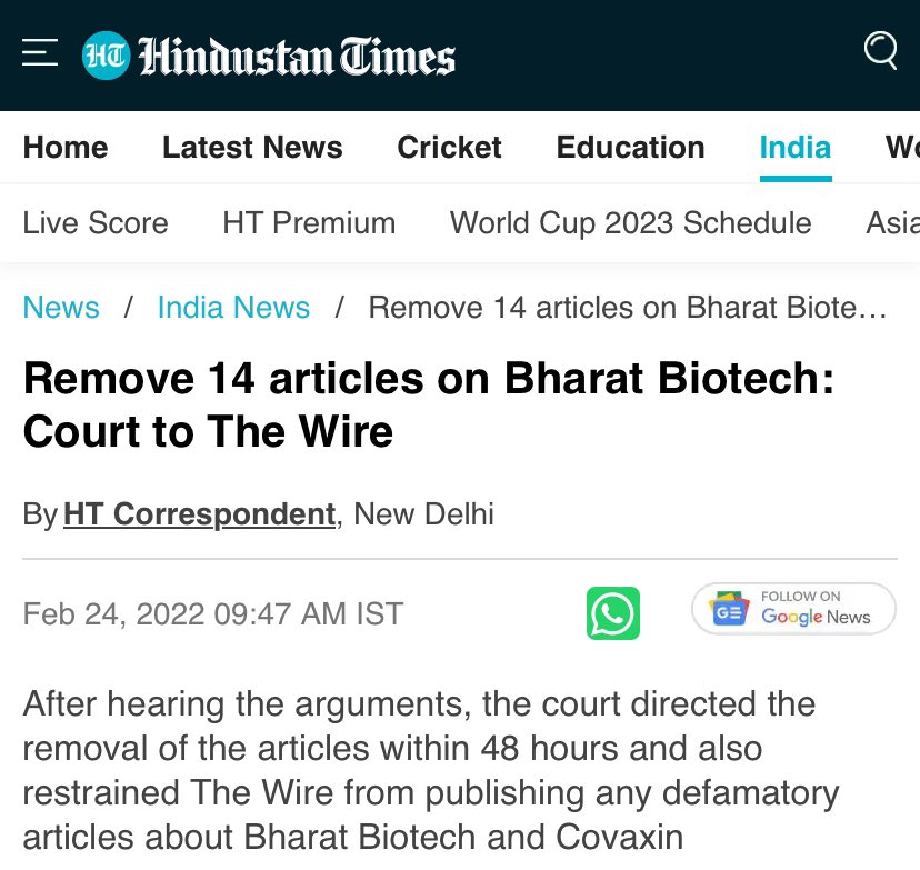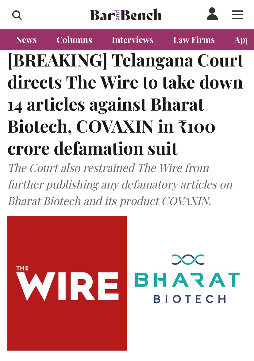 Bharat Biotech reached court against The Wire and court ordered The Wire to delete all 14 fake articles.