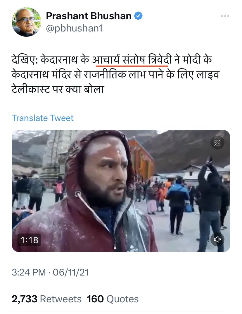 'Acharya' Santosh Trivedi criticised live telecast of PM Modi's visit of Kedarnath.