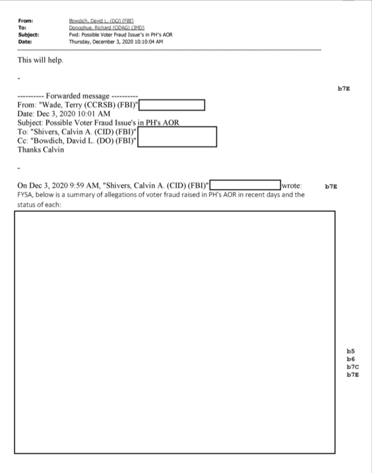 🚨🚨🚨Popping in for an hour to share some foia news on election fraud investigations in 2020 that were reported to Richard Donoghue at DOJ. 30 pages totally withheld by the FBI and USPS IG. Seems from the two pages produced that it mostly dealt with Pennsylvania. Images below.