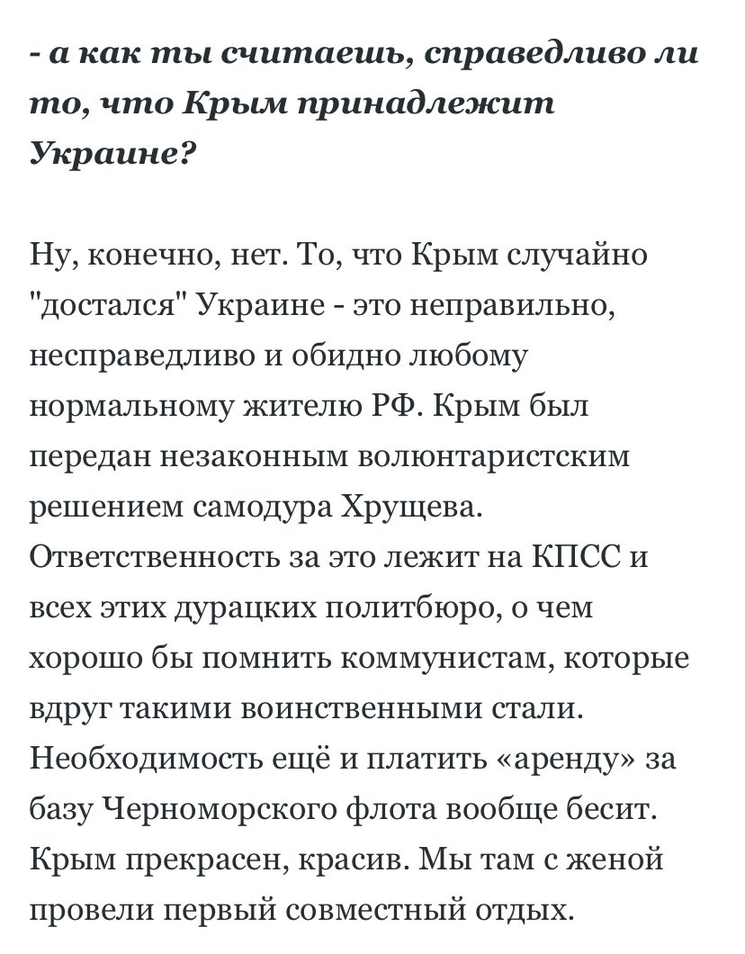 I wonder who gave all these interviews throughout the years and refused to acknowledge that Crimea must be unequivocally returned to Ukraine. Navalny's evil twin? Navalny condemned the way Crimea was annexed but didn't denounce the idea of Russia's control over it. 1/4