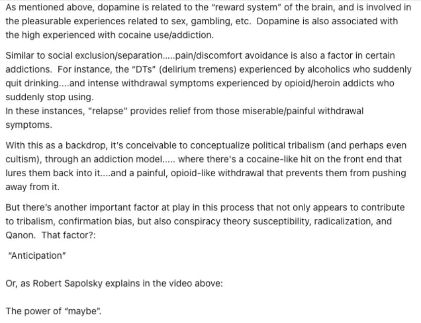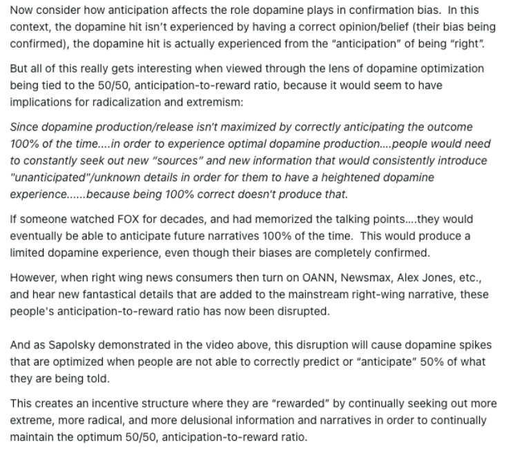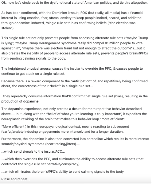Several things expand upon concepts/theories that I’ve previously observed/analyzed through a political lens including dopamine/addiction, emotion over logic/reason, etc.