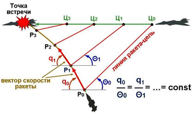 (7/24) The missile is steered by the method of proportional navigation, using signals generated by the seeker head: the missile will attempt to keep the ratio between the angular velocity of its movement vector and the target-missile line vector constant.