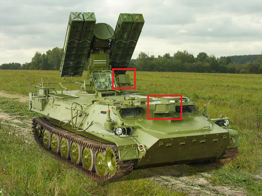 (15/24) Strela-10M2 TELARs (9A34/35M2) onward are also fully amphibious. They are equipped with rectangular polyurethane floats on the sides, and can launch while floating as well. The rectangular box above the launcher is the 1RL246-10 IFF. It is not always mounted.