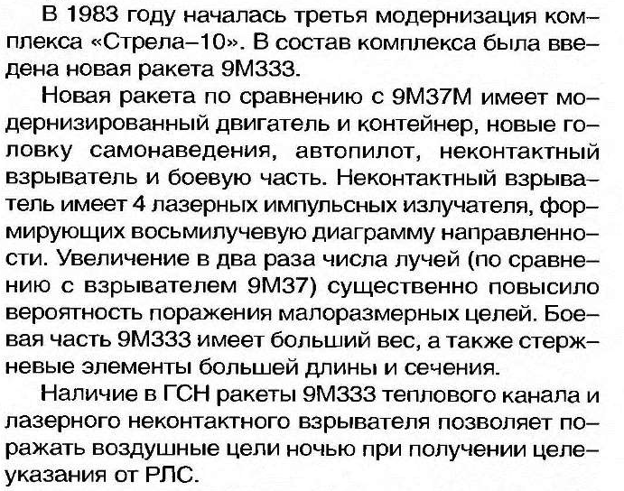(16/24) Strela-10M3, the last Soviet variant, introduced the 9M333. This had a larger warhead (2.6 kg explosive) with larger rods and a 3rd home-on-jam (IRCCM) guidance channel. The autopilot was further improved as well. topwar.ru/178528-zenitna…