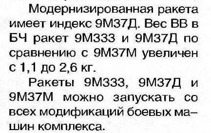 (17/24) The most obvious difference is the number of laser fuse windows has been doubled from 4 to 8 to improve capability against small targets. Older missiles can be upgraded to 9M333 standard as 9M37Ds by replacing the seeker, warhead, and fuse sections.