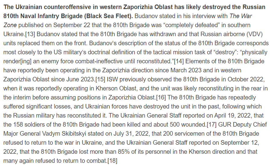4/ Budanov‘s description of the status of the 810th Brigade corresponds most closely to the US military‘s doctrinal definition of the tactical mission task of “destroy”: “physically render[ing] an enemy force combat-ineffective until reconstituted.” isw.pub/UkrWar092323