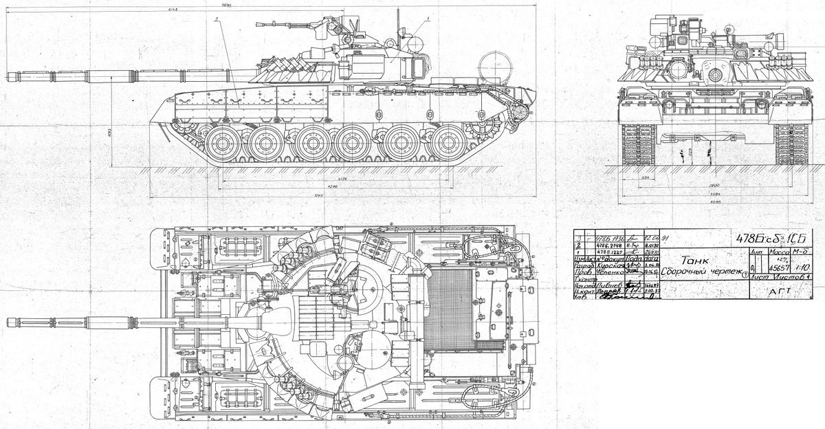 (2/10) Won't translate whole article, just outline key variants. 'Classic' 1987/89 T-80UD (blueprint 478Bsb-1): 'early' (blueprint/right #187 in the famous coup photo), 'late' (left/centre in photo) has heat shield on the engine compartment roof.