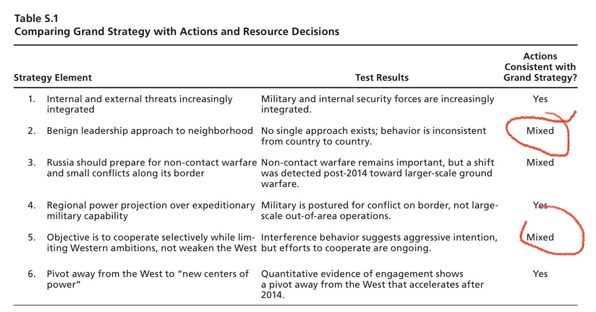 In 2019, Rand Co. completed a “Russian Grand Strategy” report for the Pentagon with first author S. Charap. Here is a table with conclusions. First column has Russian claims. Astoundingly, the report gives a “mixed” assessment on Russia’s claim it is a benign regional leader.