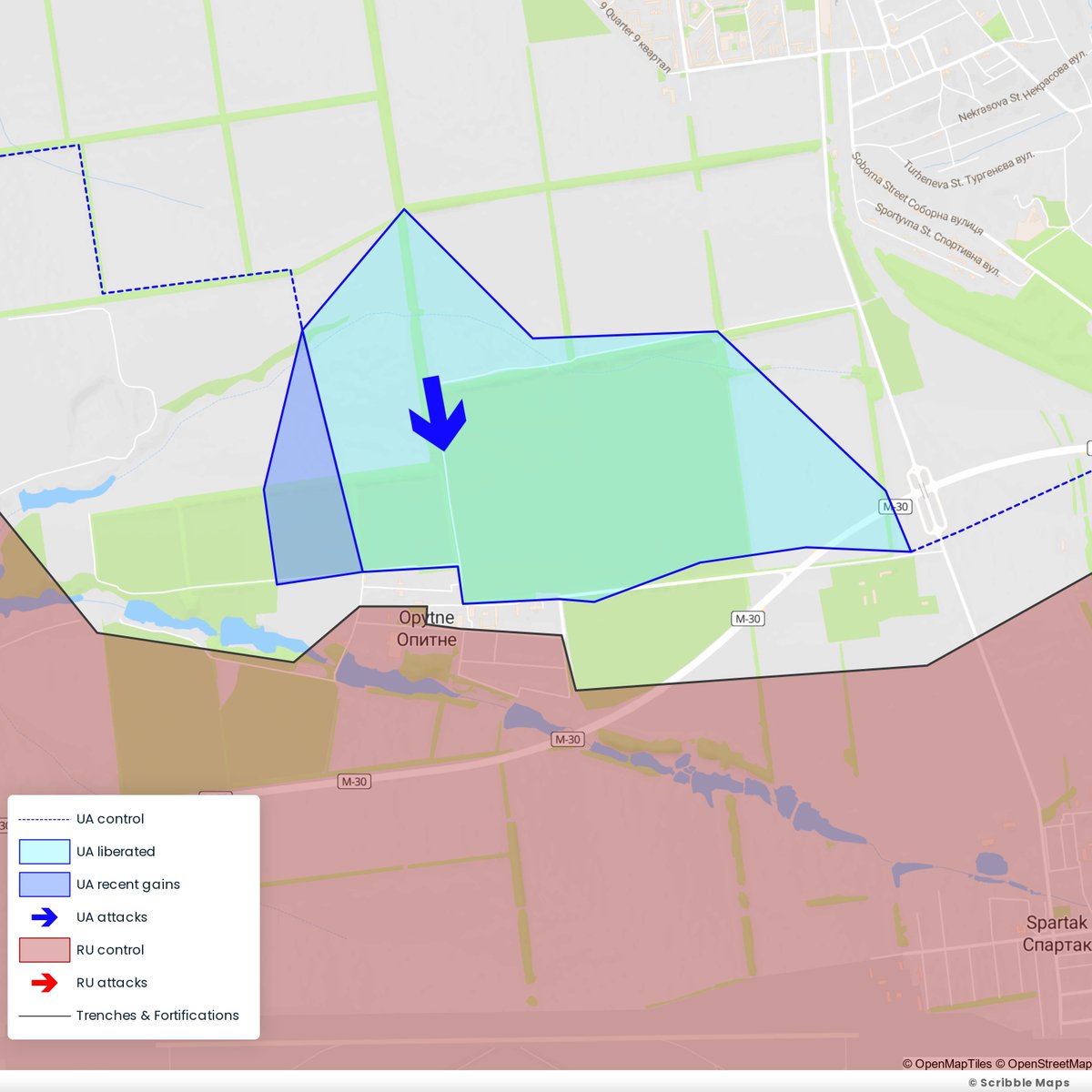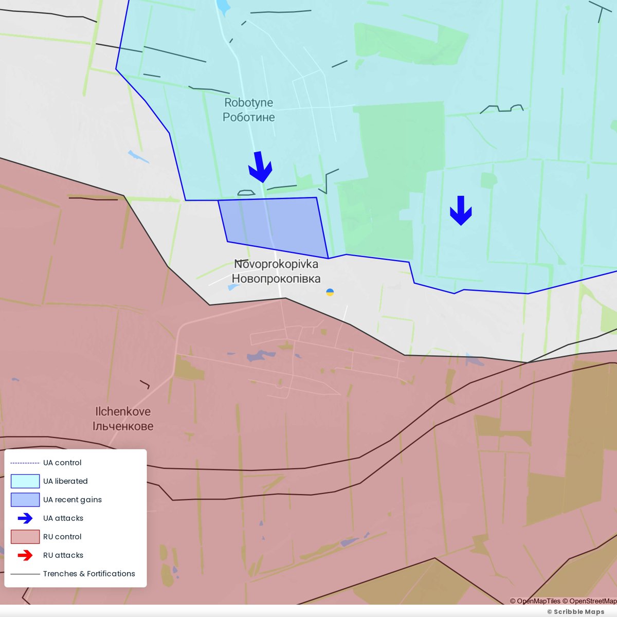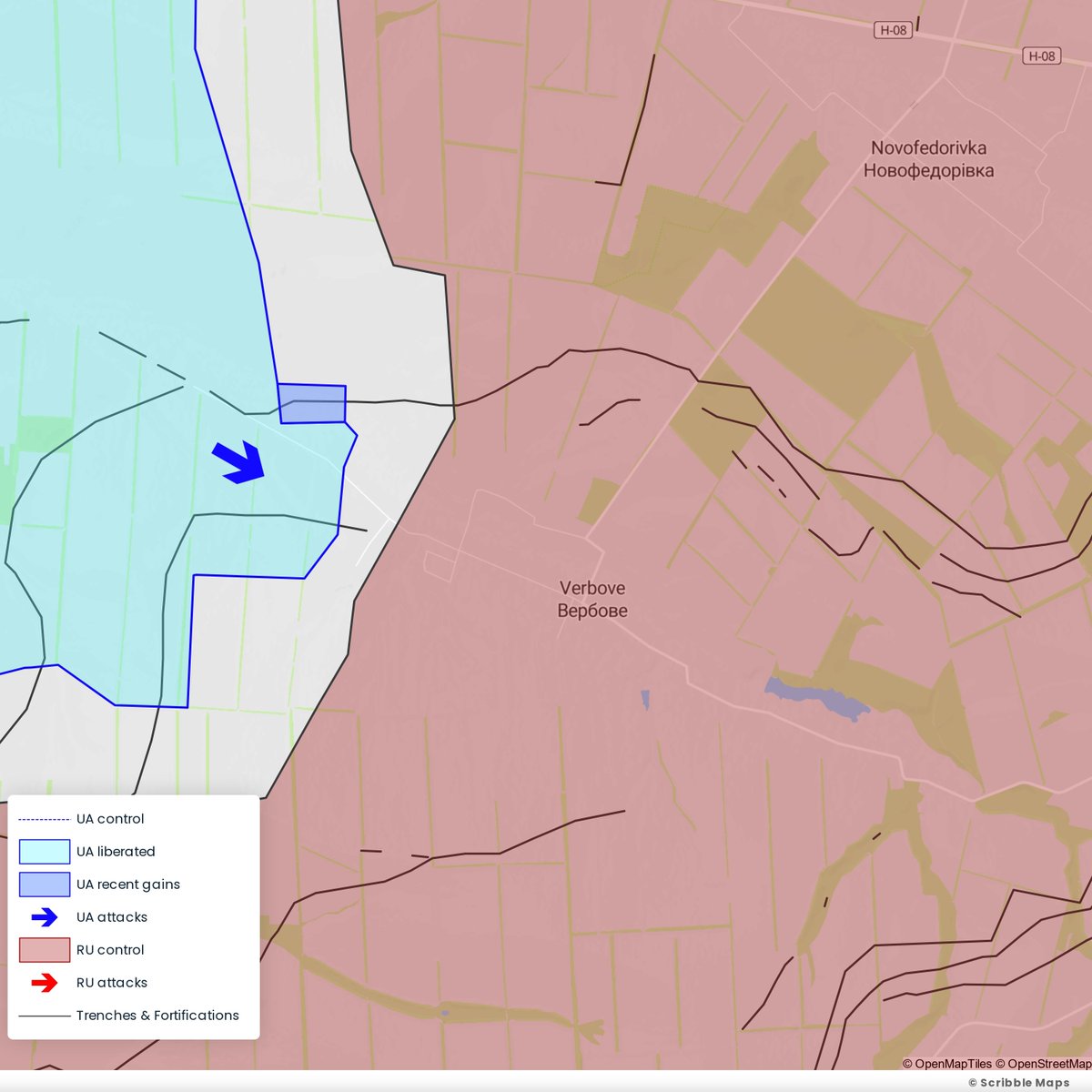 ➡️Northeast of Verbove, the AFU has started to push along the trenchline towards Novofedorivka and made significant progress. Russians are pushed back.