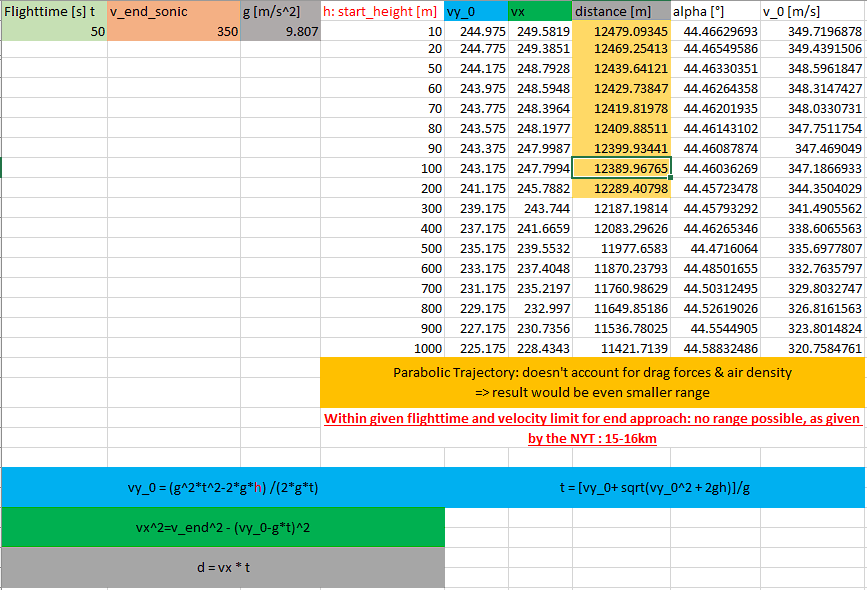 As you see, there is no scenario of flight time, range and subsonic impact speed, which checks out with the data from the NYT, for an engine failure. Any increase in speed will lead to drastic overshoot or supersonic impact. Mind you, this is without friction / drag.