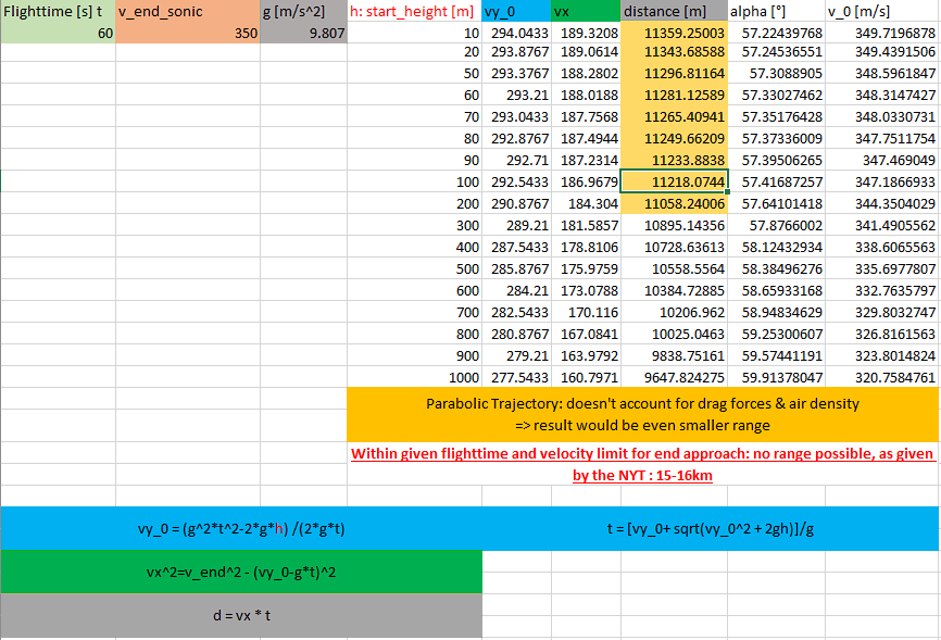 If we take a look at the equations and do little excel time, we can determine the velocity and range a missile gets at start, based on start height. And...nope, doesn't check out. omnicalculator.com/physics/projec…