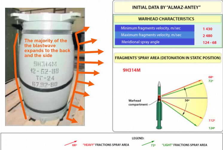This illustration reveals a few details about the warhead. From the dispersion angle in static position we can conclude that the majority direction of the blastwave is to the side and the back.