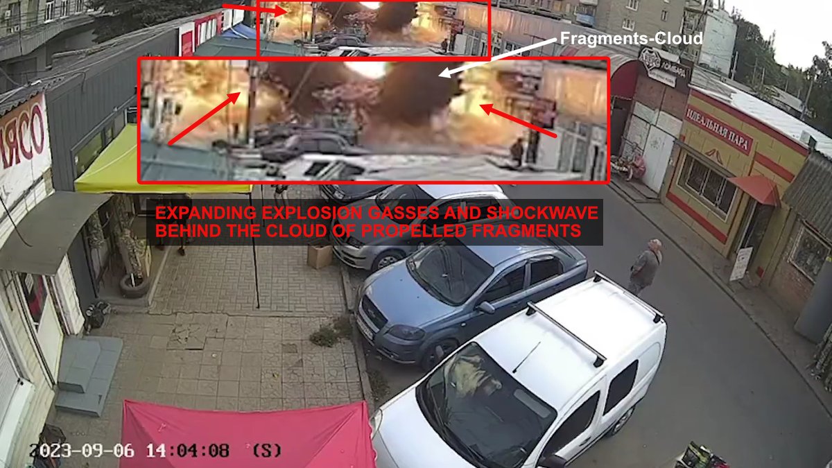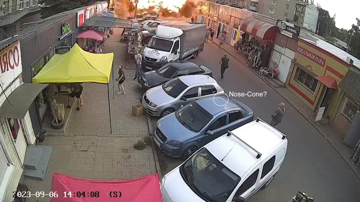 The incoming missile, which might have sustained damage by intercepts, with an active contact fuse, hit the street under a shallow angle and disintegrated (crater, car explosions/fire in the back). The deformed front part was reflected upward and detonated a few ms later midair