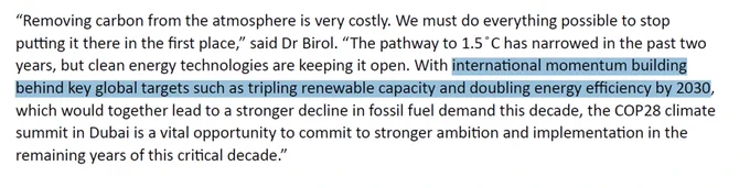 So as we go towards COP28, the IEA clearly want to get a global deal that triples renewables and doubles energy efficiency... and that would give us the two most important building blocks to reduce fossil fuel use by ⅔rd's by 2035.💪<END>