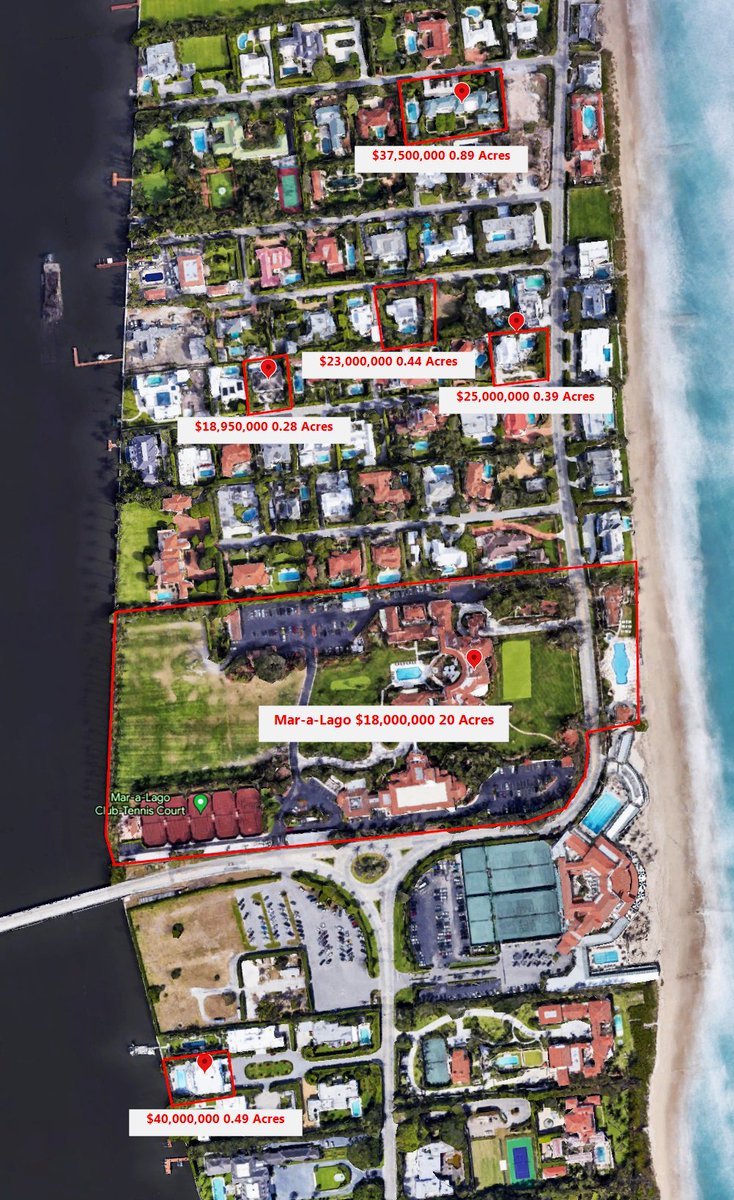 Mar-a-Lago, the 20-acre property in the middle, is worth less despite being 20 to 70 times larger.