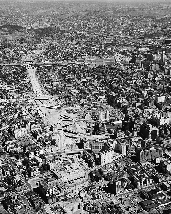 Construction of the 110 in the 1950s required the demolition of thousands of homes and buildings across Downtown and South Los Angeles. Simultaneous “urban renewal” projects cleared vast swaths of the city, also displacing thousands of residents.