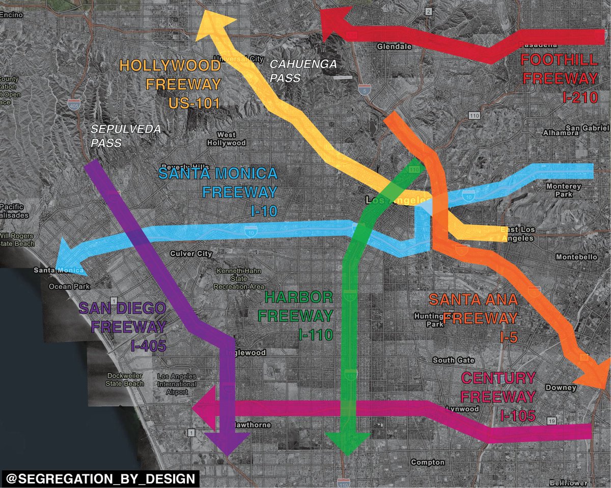 "Across Southern CA, freeways that paved over Black and Latino neighborhoods—such as the 5, 10 & 110—were completed, while those proposed to cross whiter, more affluent areas were stopped," writes @latimes. The 110, seen here, cut through South LA, displacing tens of thousands.