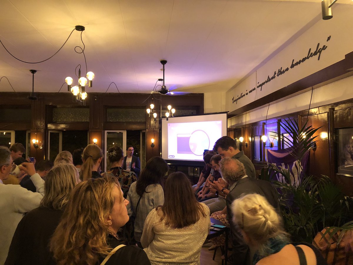 Ander idee: een paarse ballenbak op het plein. Inmiddels is de borrel begonnen maar Jasper - inmiddels de moderator - doet nog zijn best boven de club uit te komen.