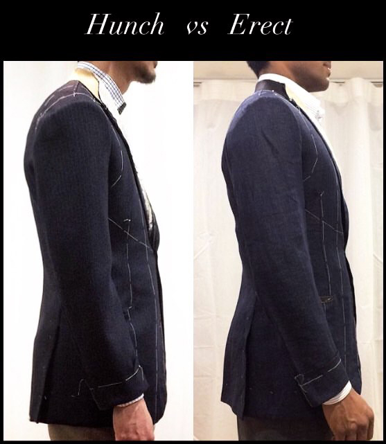 A proper coat will be made so that it fits according to your natural posture. Some people naturally stand with a bit of a hunch. Others stand very erect. A proper coat will fit your natural posture so that the collar hugs your neck at all times.
