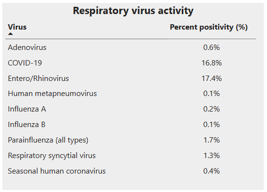 Right now in Ontario is almost an equal percent test positivity for COVID-19 and Entero/Rhinovirus while very little of anything else yet ( ). 5/ publichealthontario.ca/en/Data-and-An…