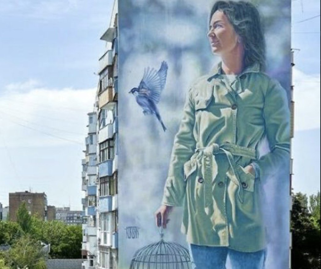 Das Gemälde besitzt den Namen "Auf ein Treffen mit dem Glück" und zeigt eine Frau mit einem Vogelkäfig. Neben ihr der befreite Vogel. Die Idee wurde von den Worten einer der Frauen inspiriert, die in einem der Schutzhäuser in der Ukraine Hilfe erhielt./2